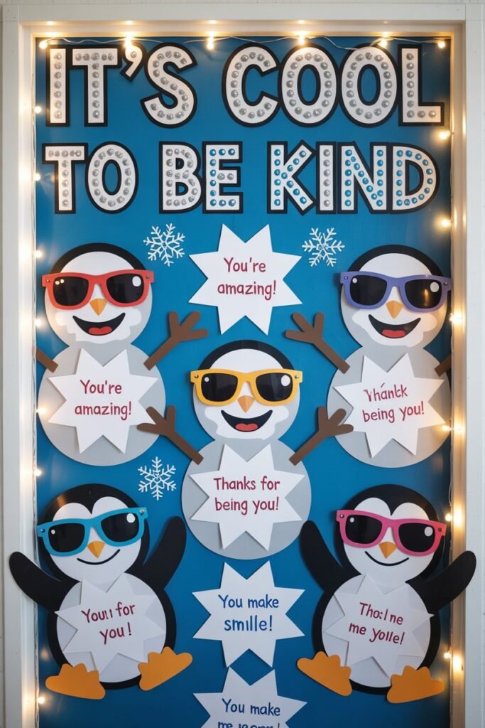 I promote kindness during the holiday season by creating cool-looking snowmen or penguins wearing sunglasses. I have students write kind messages to their classmates on paper snowflakes that I add to the display.