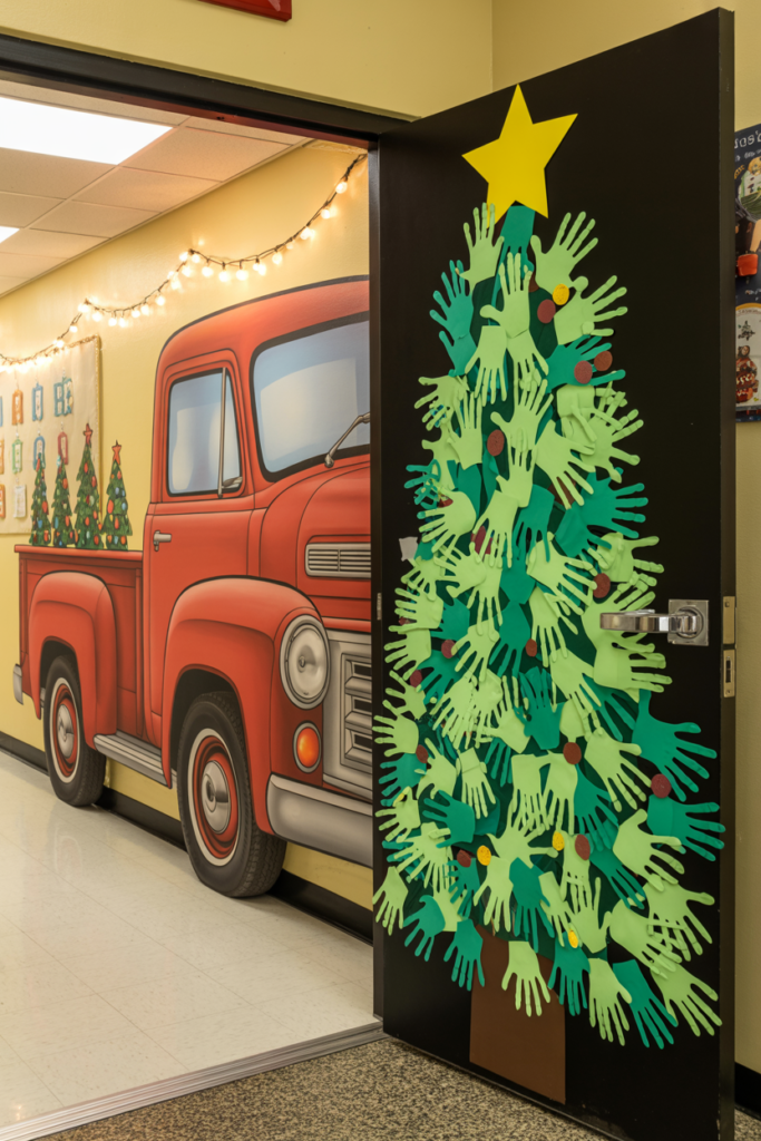I extend this creative idea into the hallway by creating a vintage red truck carrying a Christmas tree made from student handprints. One door becomes the truck’s front while another displays the tree.
