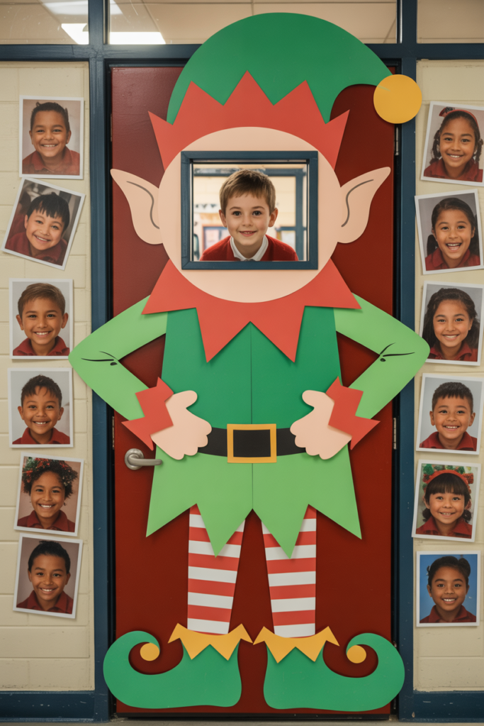 This modern twist on the classic elf theme works perfectly if your classroom door has a window. I cut out a large elf body from colored paper and position it so the window becomes the elf’s face.