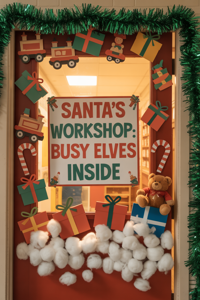I set up my door to announce “Santa’s Workshop: Busy Elves Inside” to show that my students are working just as hard as Santa’s elves. I add cutouts of toys, candy canes, and cotton ball “snow” to complete the workshop atmosphere.