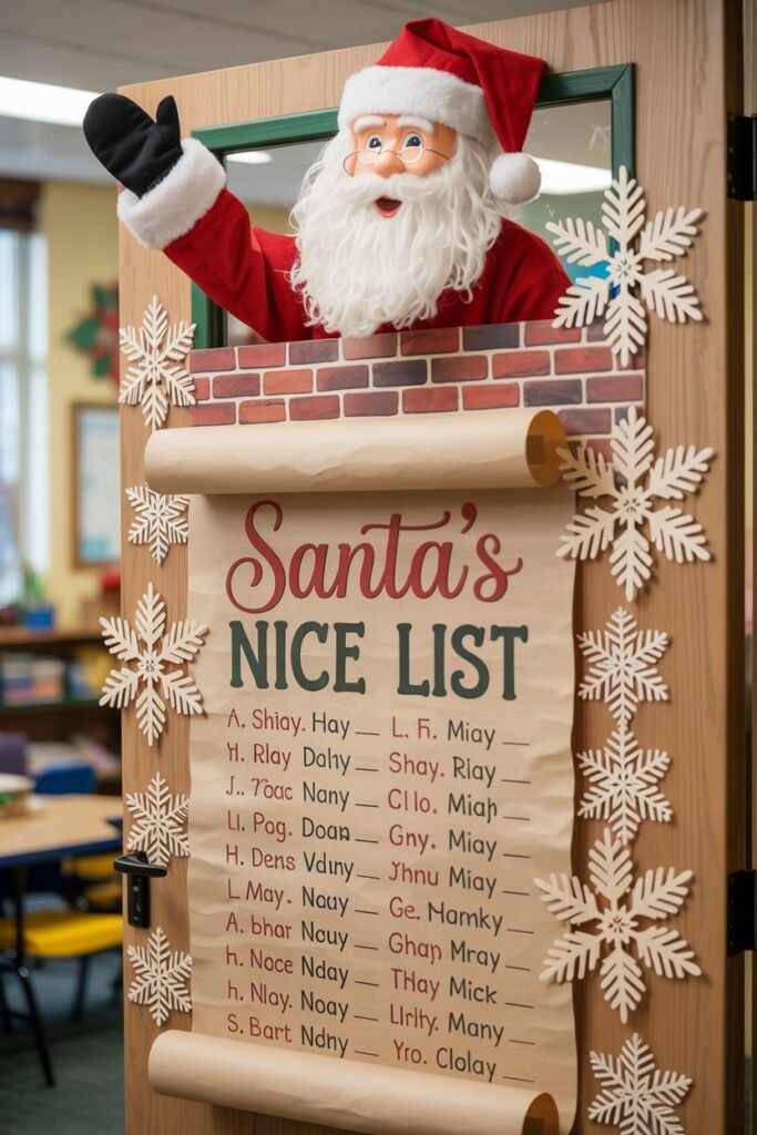 I create a giant scroll from brown paper and label it “Santa’s Nice List” with every student’s name written in festive lettering. I surround the list with paper snowflakes and add a cheerful Santa figure peeking out from a paper chimney.