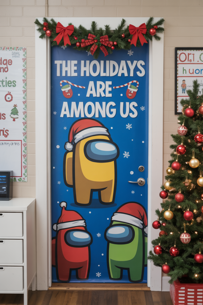 I tap into what my students love by creating “Among Us” crewmate characters dressed in Santa hats and holiday gear. The phrase “The Holidays Are Among Us” gives this popular game a festive twist.