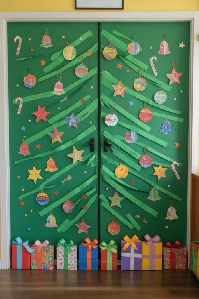 I turn the entire door into a giant Christmas tree using green paper, then have my students create and decorate paper ornaments to hang on it. I add wrapped “presents” at the bottom using colorful wrapping paper scraps.