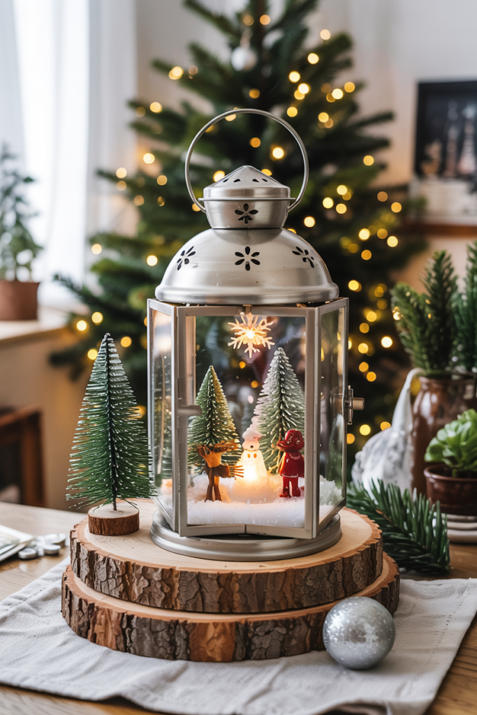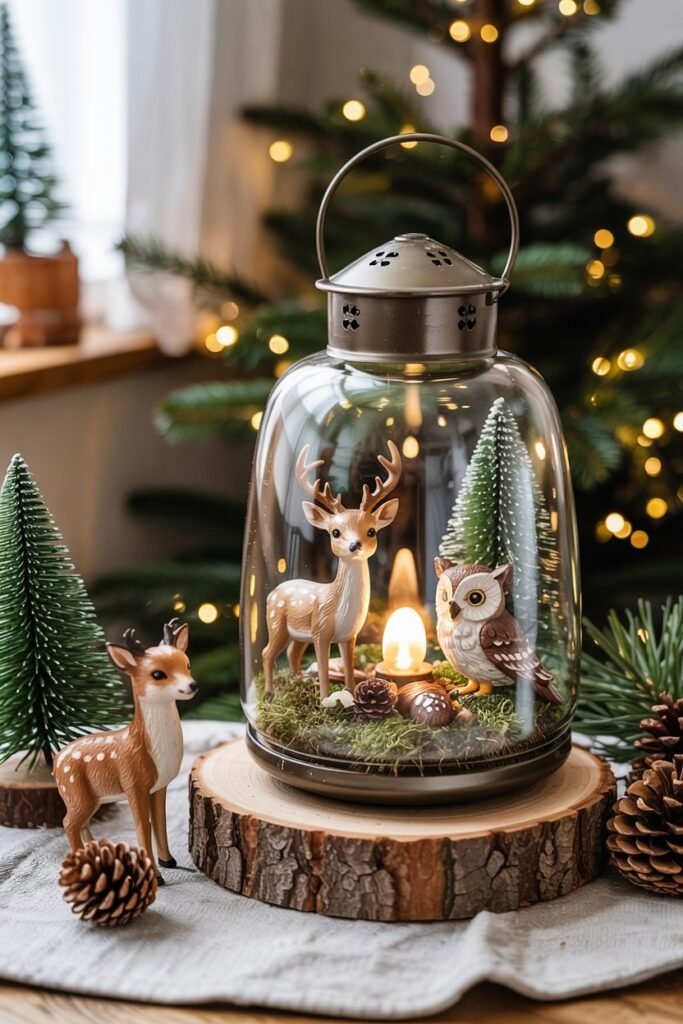 Design a charming and peaceful woodland scene with miniature animal figurines. Place a small, realistic faux deer, a cunning fox, or a wise owl inside the lantern on a soft bed of moss, faux snow, or even tiny pinecones.