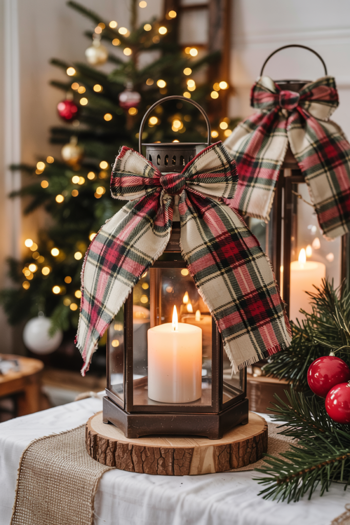 Transform any lantern into a holiday statement piece with a cheerful red bow. Tie a large, festive ribbon—such as red velvet or tartan plaid—to the top of the lantern.