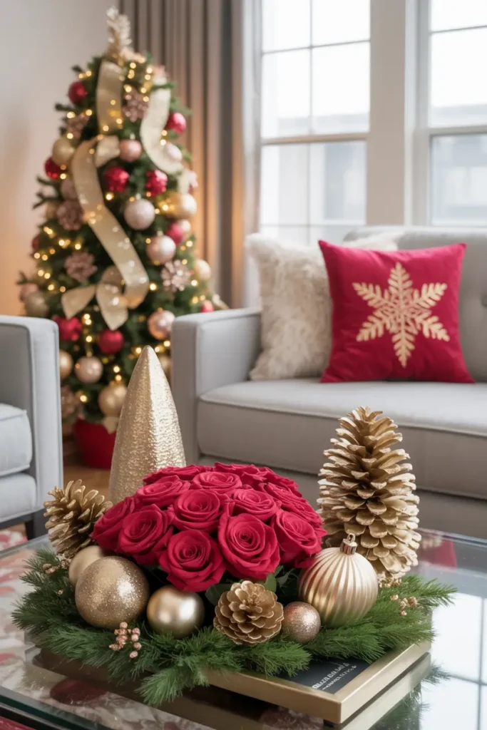 A beautiful arrangement of red roses on the coffee table can also add a touch of glamour and a pop of rich color.