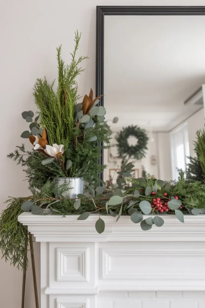 An asymmetrical arrangement of juniper, eucalyptus, and magnolia on the mantel creates a modern and sophisticated feel that I absolutely love.