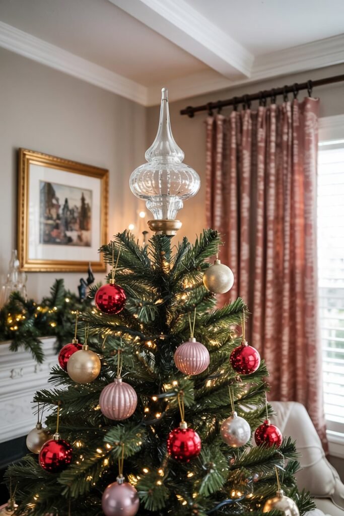 A delicate mercury glass finial, for instance, pairs perfectly with warm white lights and classic red ornaments for a sophisticated, heirloom look that never goes out of style and evokes a sense of nostalgic grandeur.