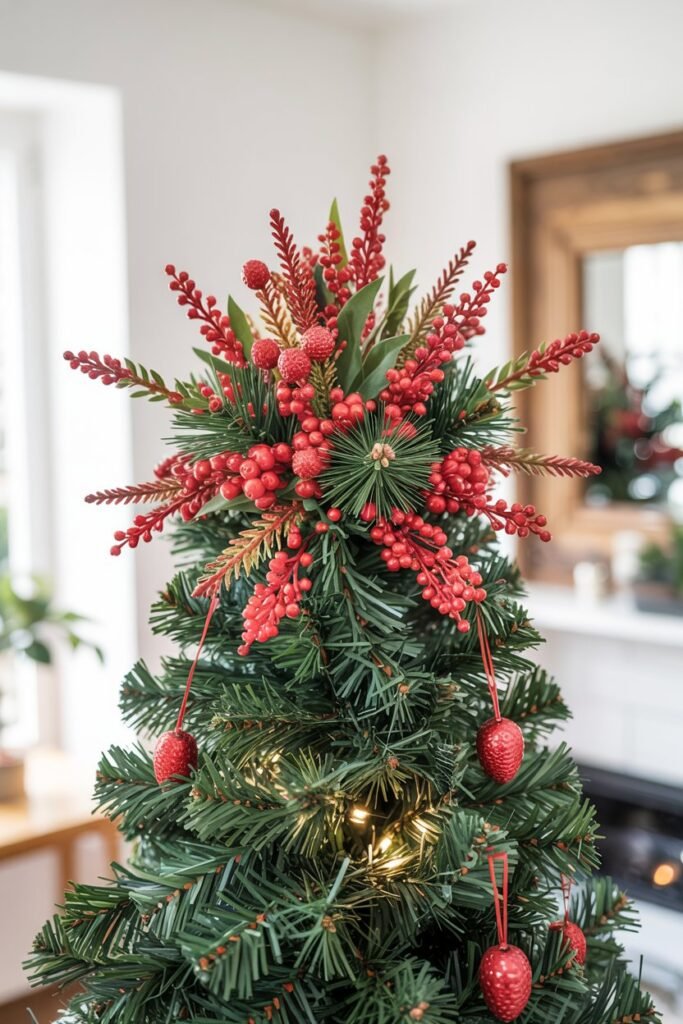 For a touch of natural elegance, a bouquet-style topper made of faux red berries is a stunning choice.