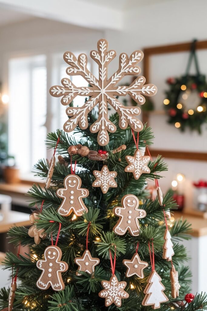 Combine the charm of gingerbread with the classic shape of a snowflake. A felt topper featuring gingerbread-style details is a sweet and cozy addition to any tree, instantly evoking warmth and homemade holiday cheer.