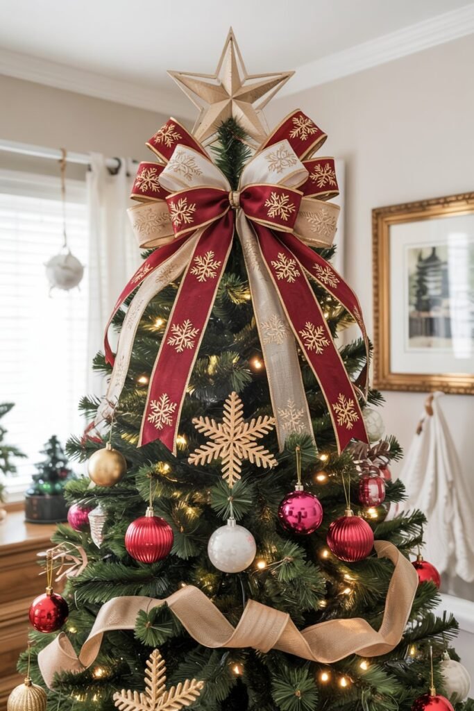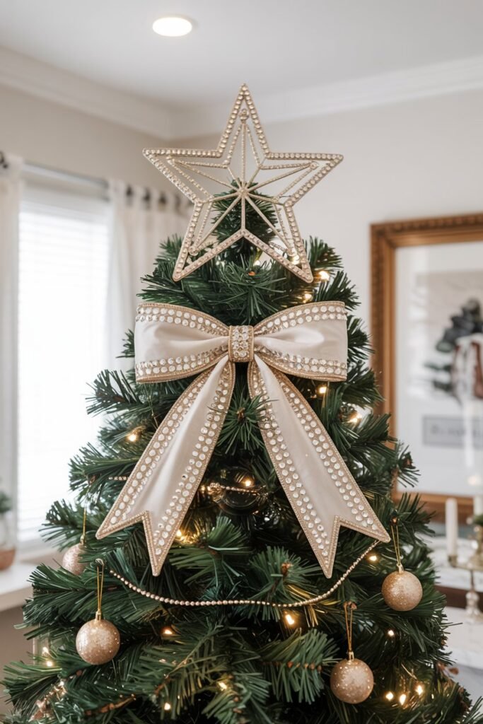 For a touch of glam without the traditional star shape, consider a large, structured bow as your tree’s crowning glory.