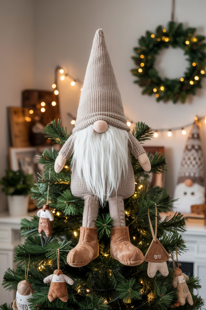 A plush gnome with a tall, knitted hat and long beard can “hug” the top of your tree, adding a touch of whimsy, charm, and Scandinavian-inspired cheer.