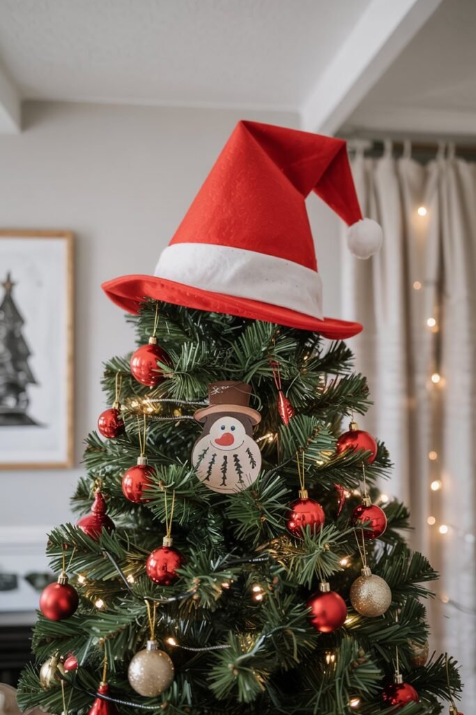Why not have some fun and top your tree with an unexpected hat? A classic Santa hat or a formal black top hat can add a quirky and unexpected twist, instantly giving your tree character.