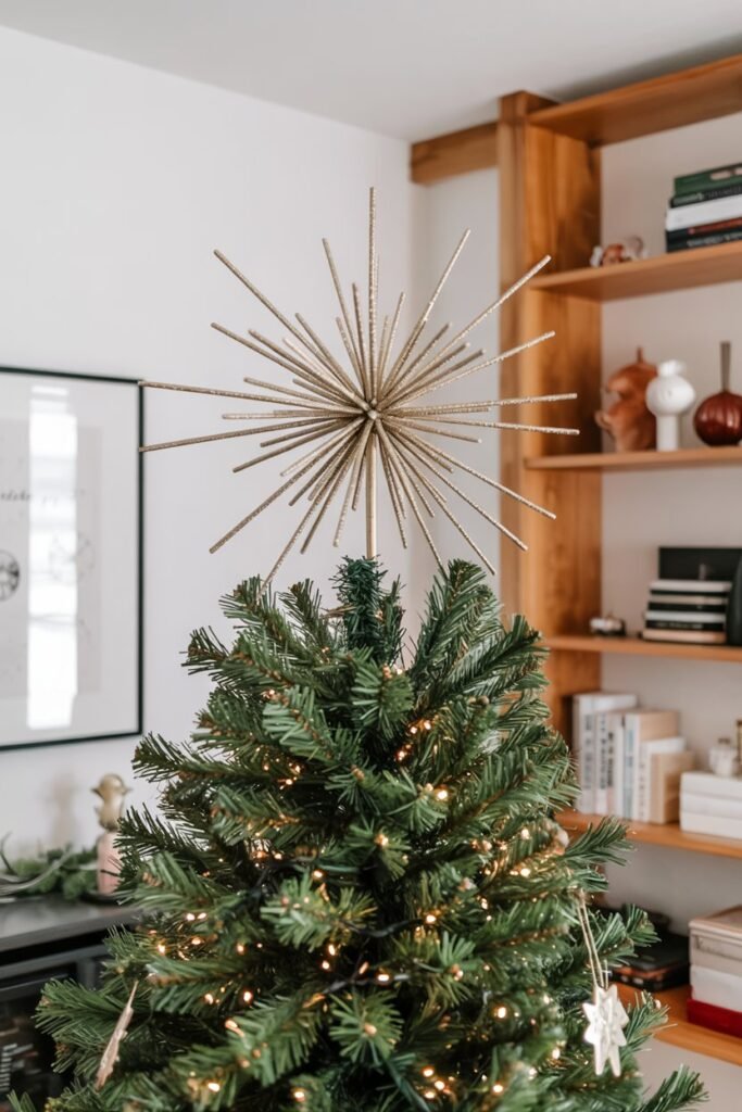 A sleek gold starburst from a retailer like West Elm can add a modern, energetic burst to your tree, complementing both minimalist, Scandinavian-inspired decor and more maximalist, eclectic styles with equal flair.