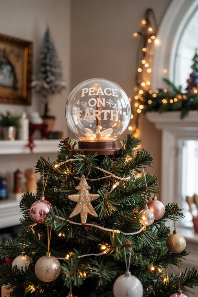 For a truly meaningful “Peace on Earth” theme, a light-up glass globe topper is a beautiful and serene choice. This unique option adds a warm, gentle, and ethereal glow to your treetop, casting soft light into the room.