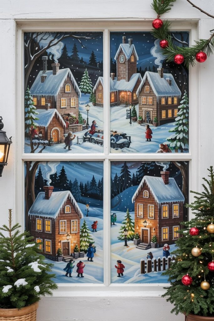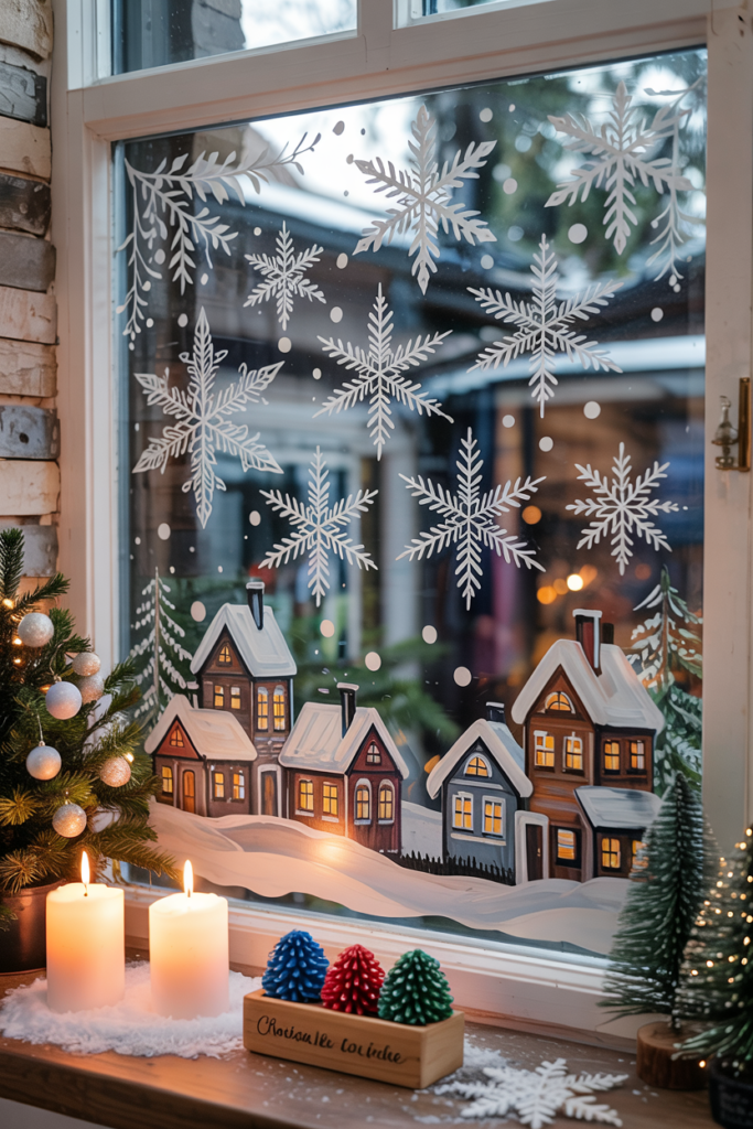 Paint intricate snowflakes in different sizes across the upper portion of your window, then add a row of cozy houses, complete with glowing windows and snow-covered rooftops along the base.