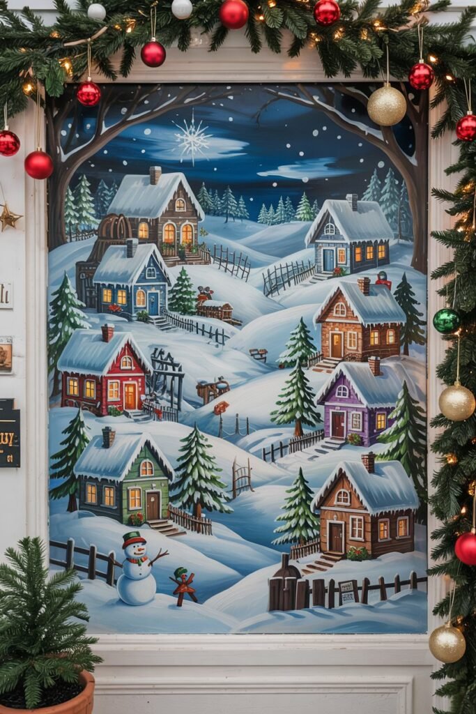 Combine multiple festive elements including a snowy village backdrop, decorative garlands, and “Merry Christmas” lettering to create a comprehensive holiday display.
