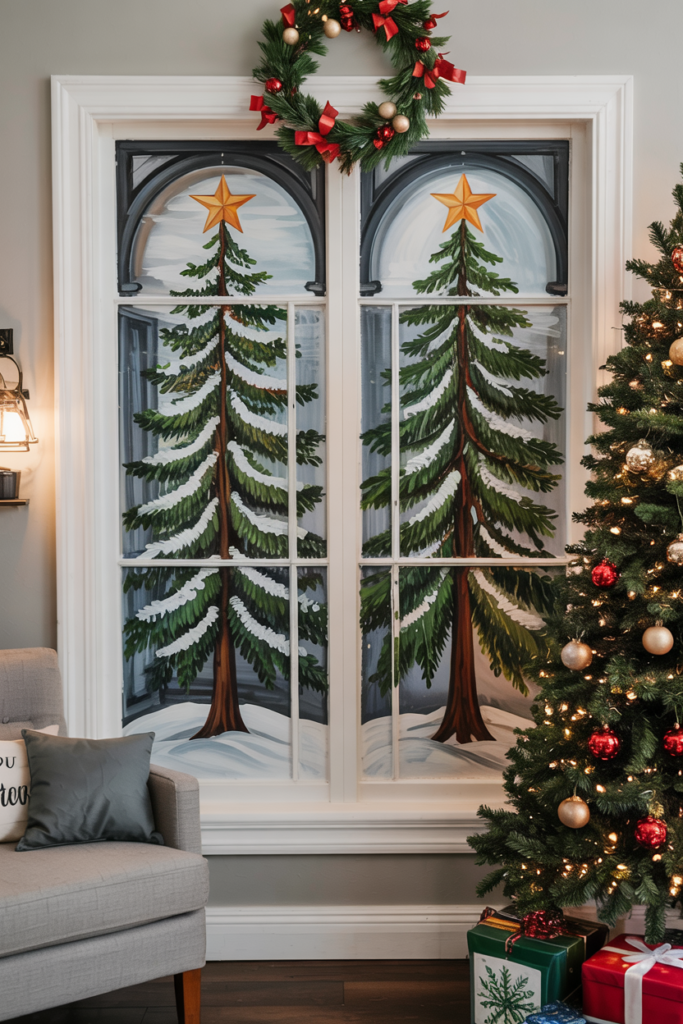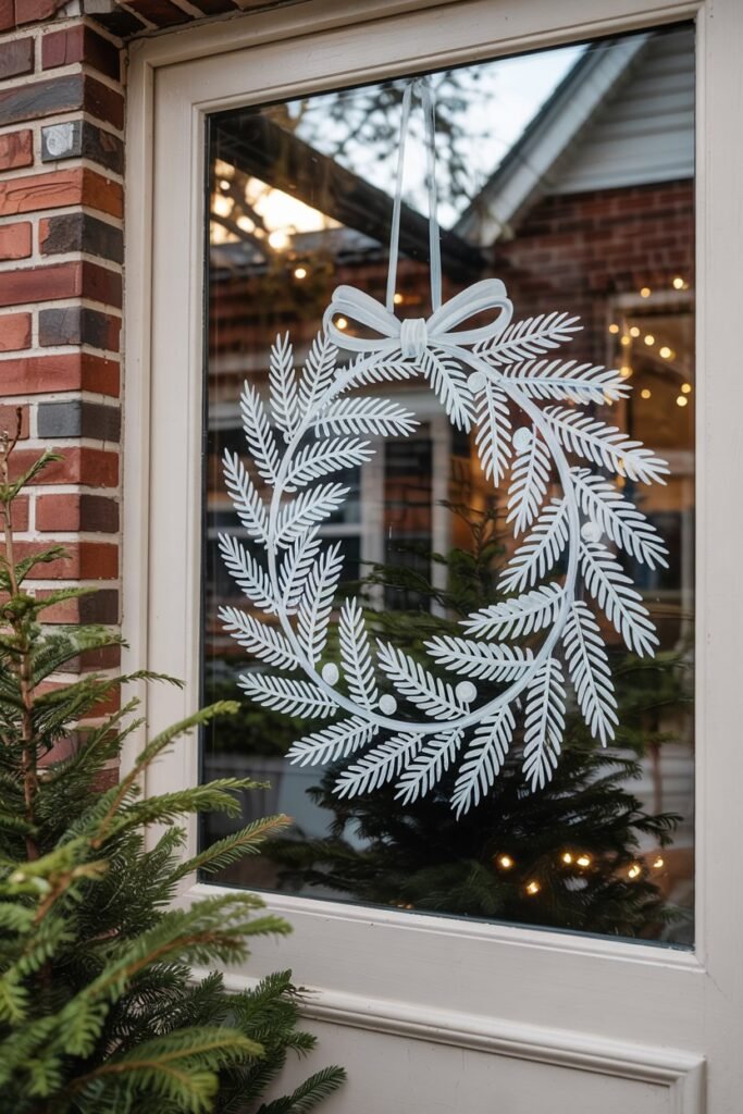 Sometimes the most elegant designs are also the simplest. Paint clean, white evergreen wreaths directly onto your glass for a minimalist yet striking effect.