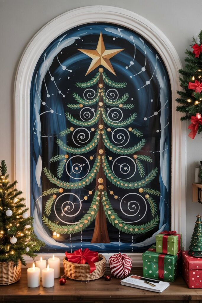 Create an unconventional Christmas tree using painted stars, swirls, and spirals instead of traditional evergreen branches, topped with a prominent golden star.