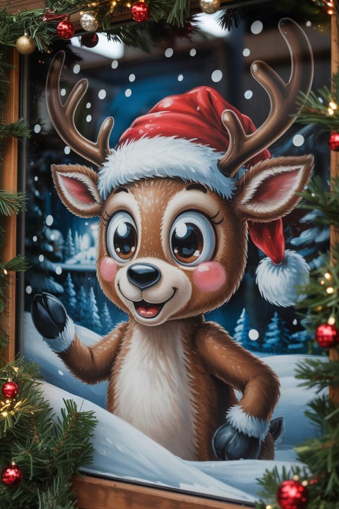Add personality through facial expressions and pose—perhaps the reindeer is winking or has a surprised expression. Include gentle snowfall and maybe some winter foliage to complete the scene.