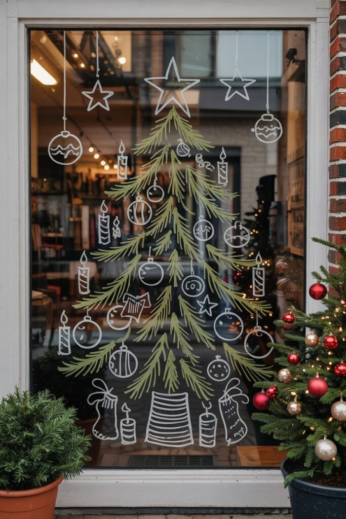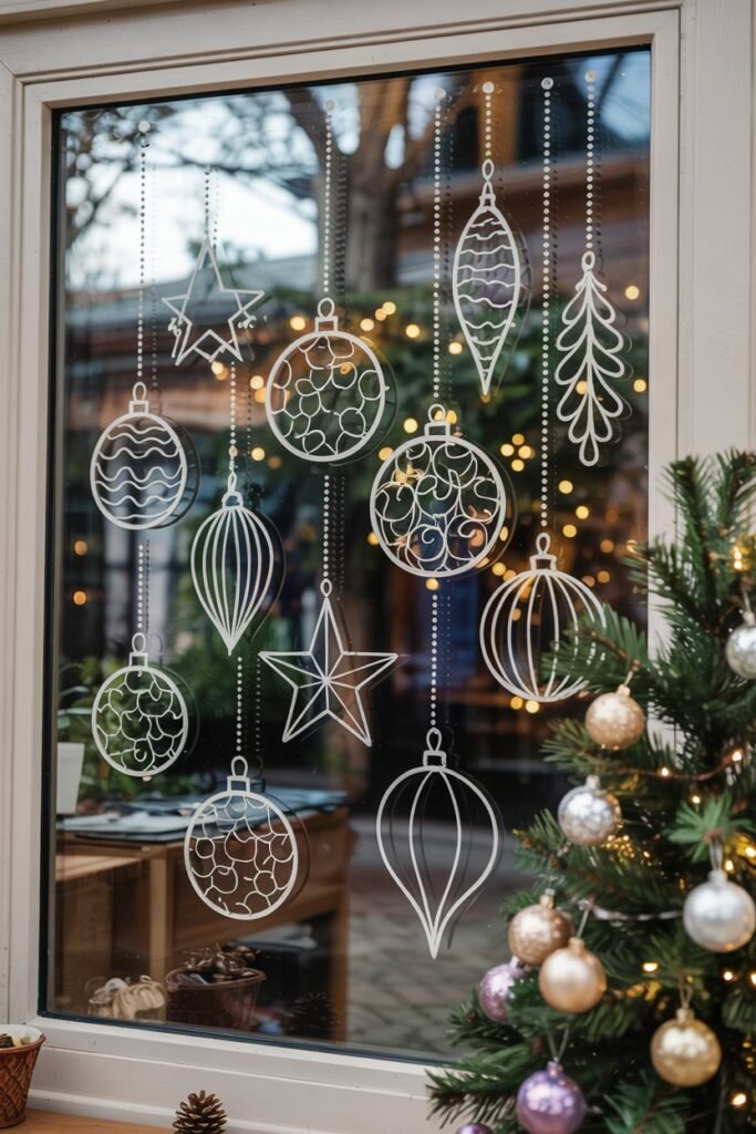 Design a sophisticated display of various hanging ornaments, stars, and pinecones outlined in white paint. Arrange these elements at different heights to create visual rhythm and movement across your window.