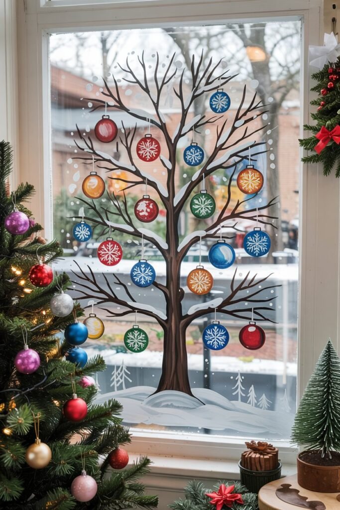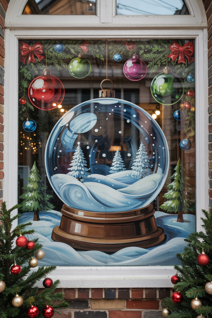 Design a large snow globe as the centerpiece of your window, framed by oversized ornaments in traditional Christmas colors like red and green.