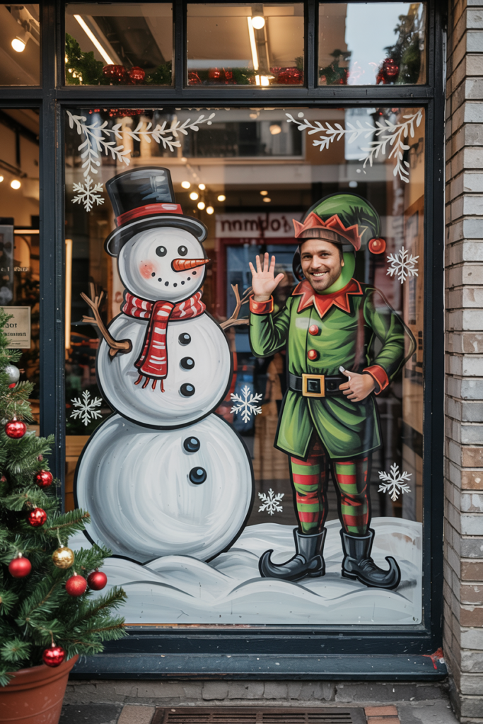 Paint a snowman and holiday elf with strategically placed face cutouts, allowing people to pose and become part of your window display.