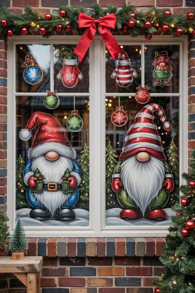 Bring whimsical charm to your windows with cheerful gnomes dressed in their holiday finest. Paint these beloved characters wearing colorful Santa hats, striped scarves, and mittens, surrounded by hanging ornaments and twinkling stars.