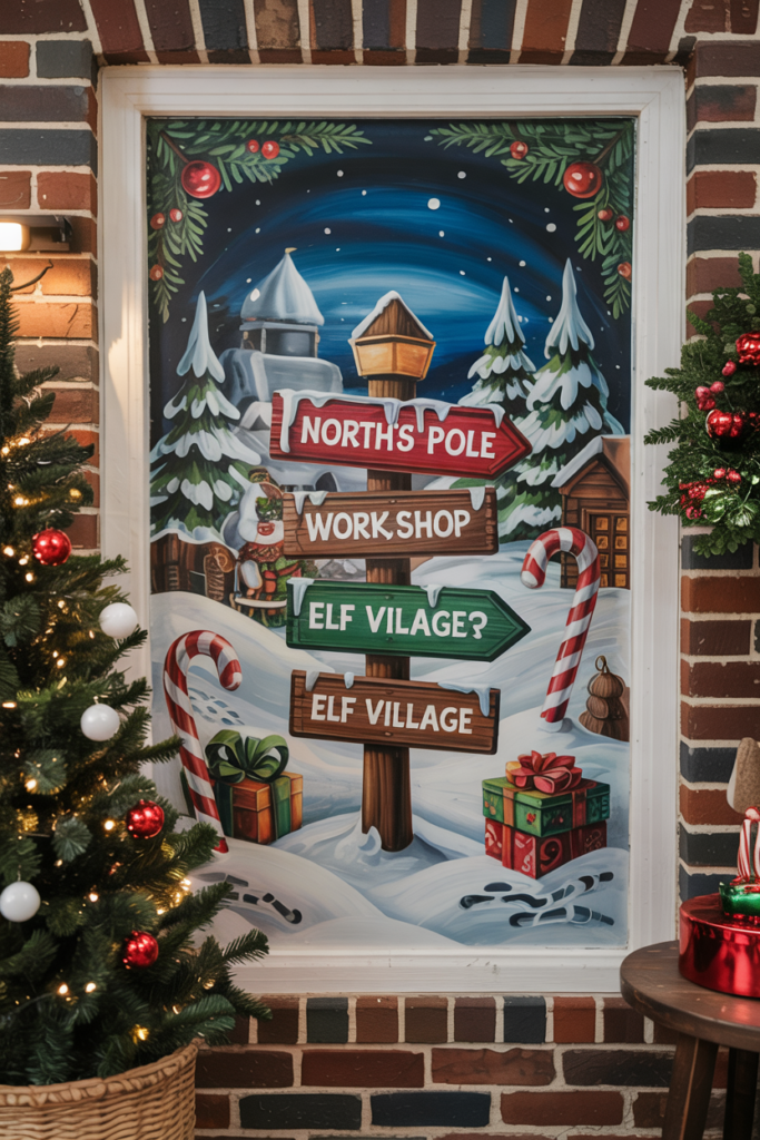 Create a whimsical North Pole scene complete with candy canes, snow-covered evergreen trees, and a decorative signpost pointing toward “Santa’s Workshop” and “Elf Village.”