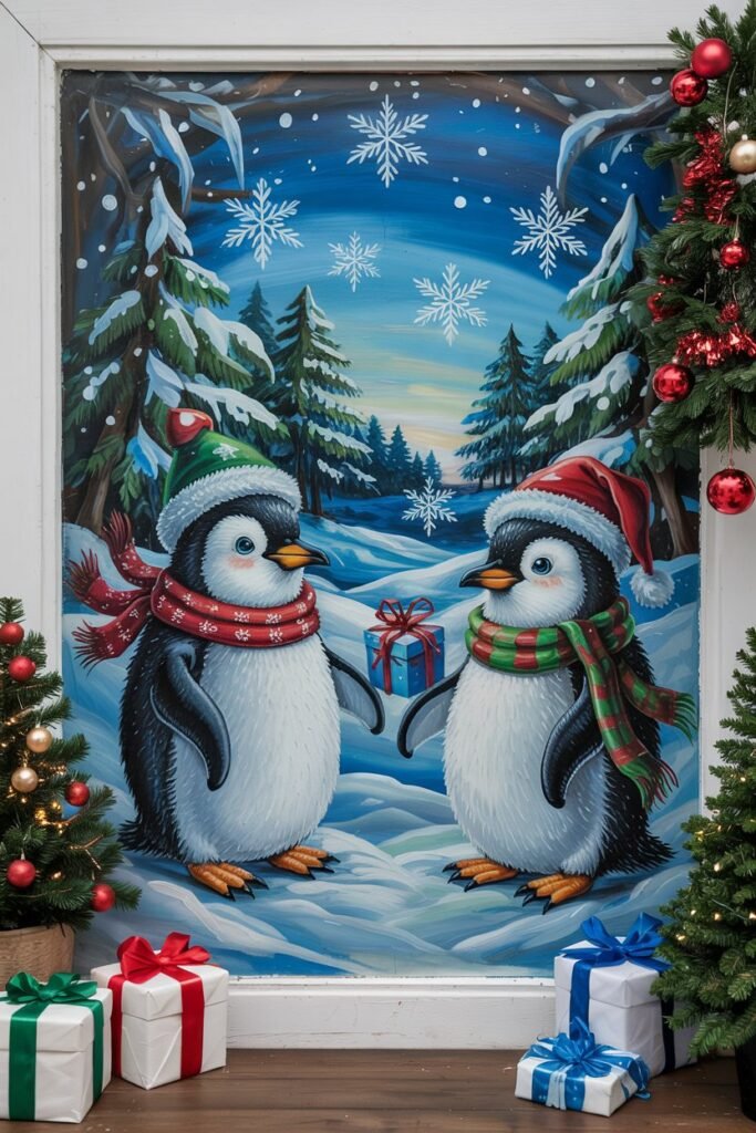 Paint cute penguins dressed in festive holiday attire against a backdrop of snowy pine trees and swirling snowflakes. These charming Antarctic visitors can wear Santa hats, colorful scarves, or even carry tiny presents.
