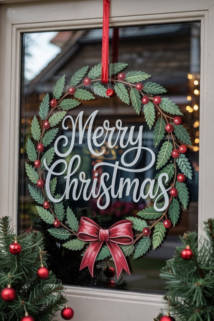 Combine the classic beauty of a Christmas wreath with festive lettering for a sophisticated window display.