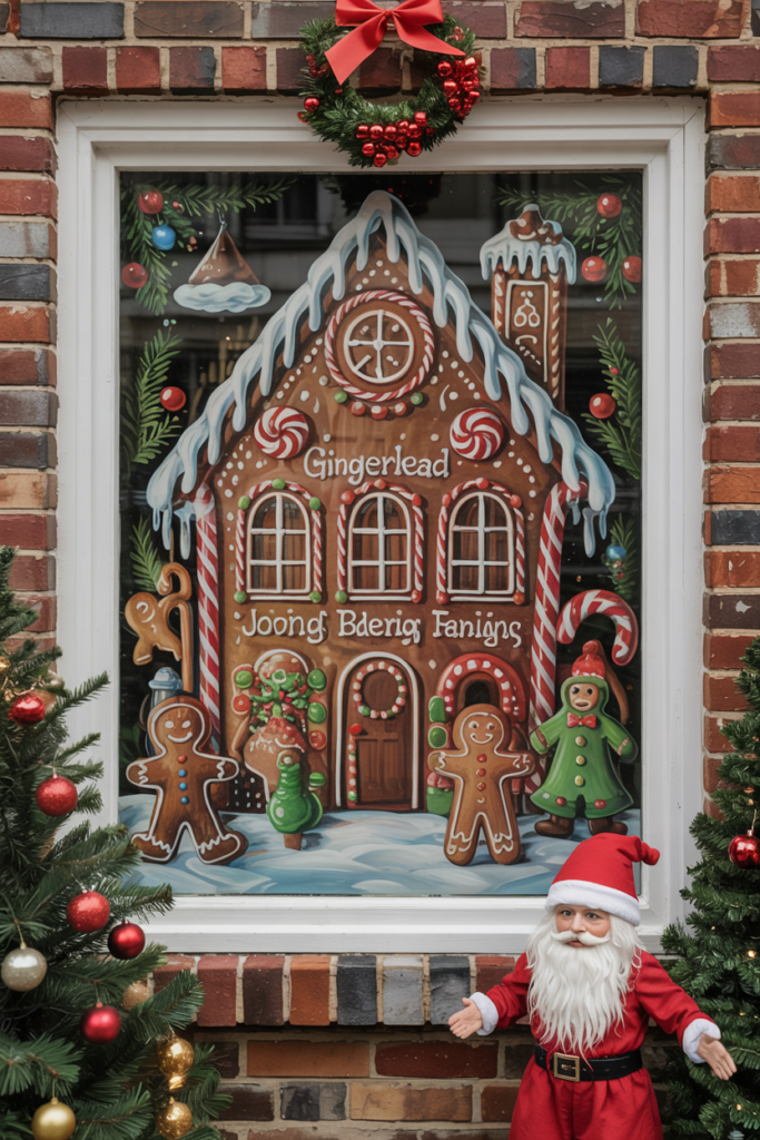 Paint a detailed gingerbread house complete with candy cane decorative elements, playful holiday characters, and festive messaging.
