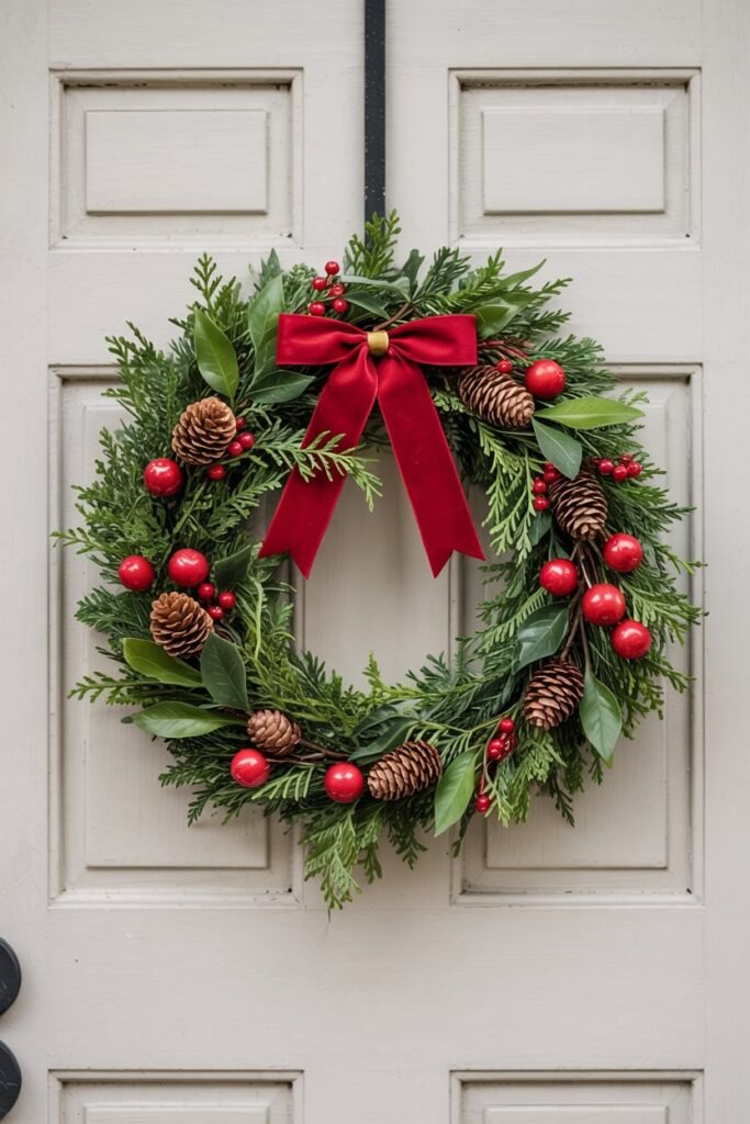 For a classic look, adorn it with a large red velvet bow and some pinecones, perhaps even a few dried berries for an extra pop of color.