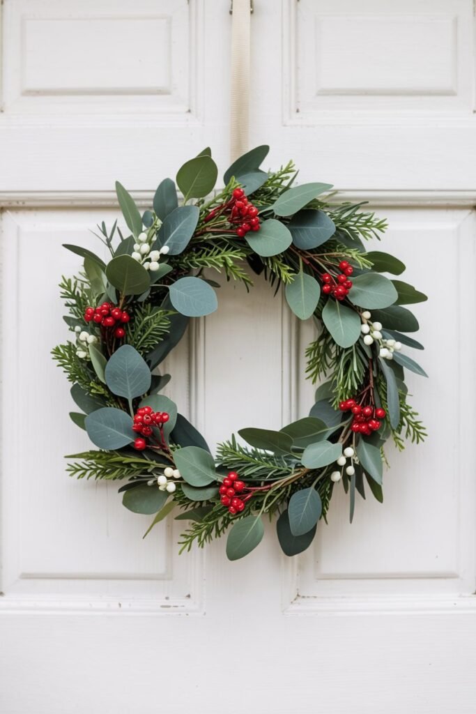 Simple yet stunning, a wreath made from fresh or faux eucalyptus offers a modern and fragrant option. The silvery-green leaves provide a soft, muted backdrop for pops of color from red or white berries.