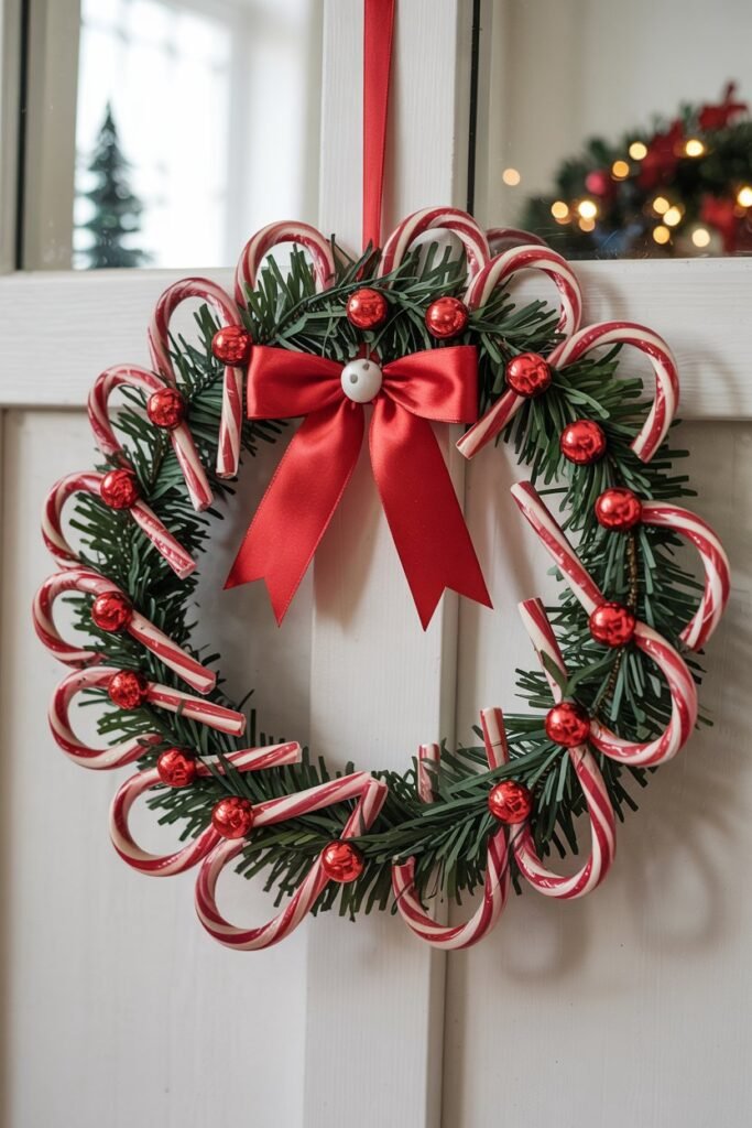 A candy cane wreath is a fun and festive project, especially for kids. Purchase a box of plastic or real candy canes and arrange them in a circle, alternating their direction.