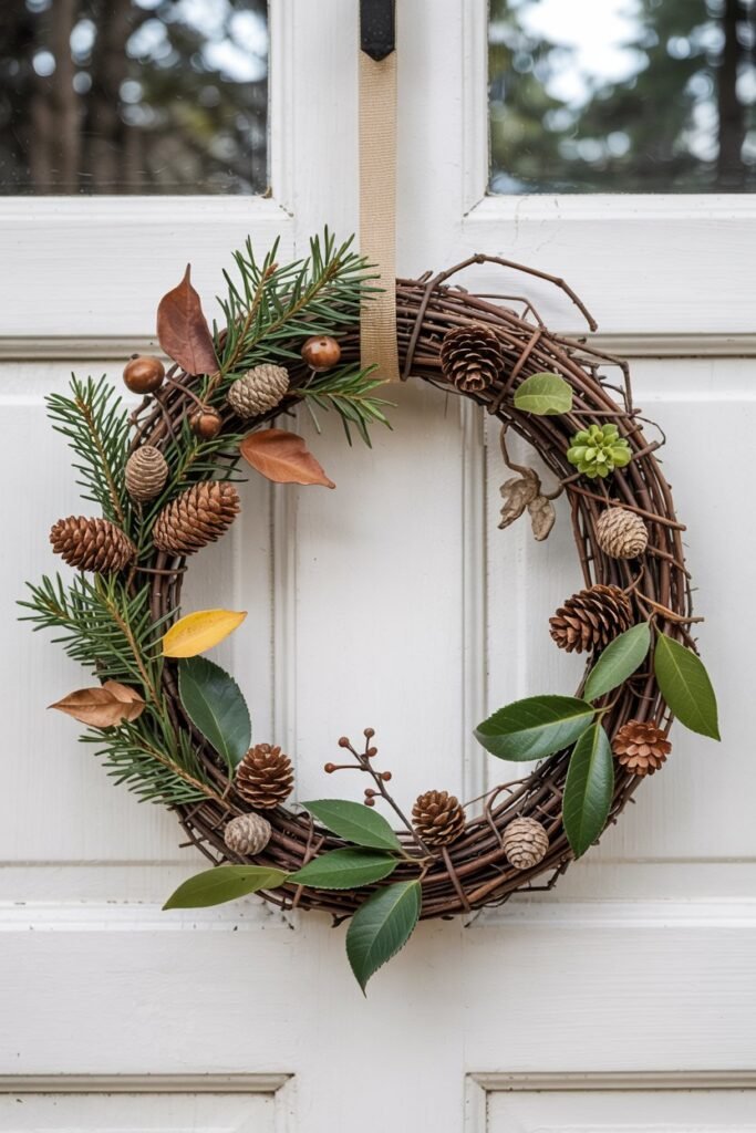 Take a walk in nature and gather materials for a truly unique wreath. Twigs, pinecones, fallen leaves, and interesting seed pods can be woven into a grapevine base.