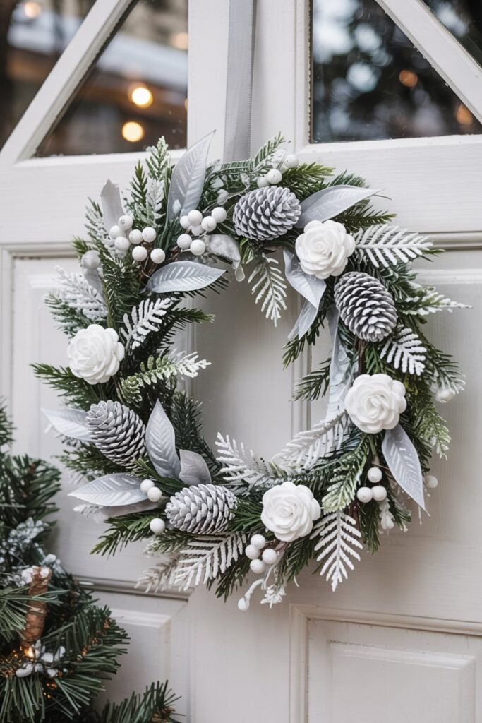Create a serene, snowy look with an all-white wreath. Use a flocked evergreen base or spray-paint a grapevine wreath white. Adorn it with white berries, faux snow-dusted pinecones, and a silver or white ribbon.