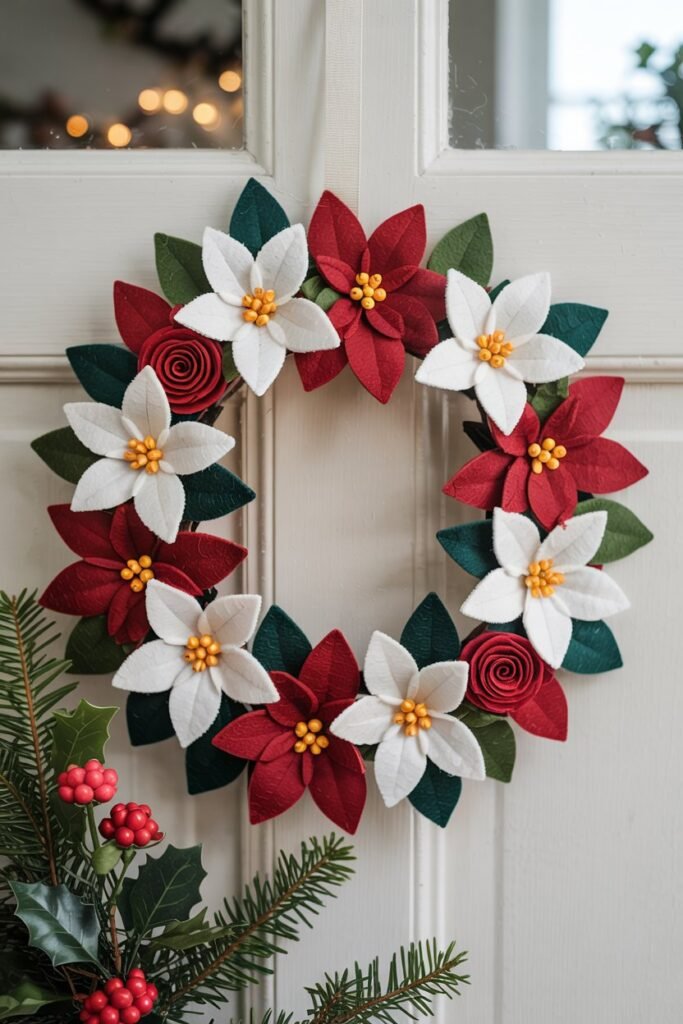 For a craft project that lasts, create a wreath from felt flowers. Cut and assemble felt into festive poinsettias, holly leaves, and winter roses.