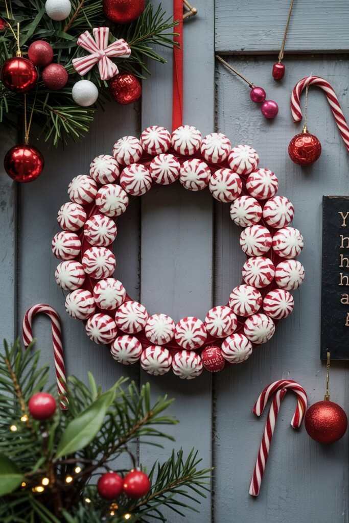 A simple foam wreath form covered in wrapped peppermint candies is a sweet and easy DIY. Use hot glue to attach the candies, creating a swirled pattern of red and white.