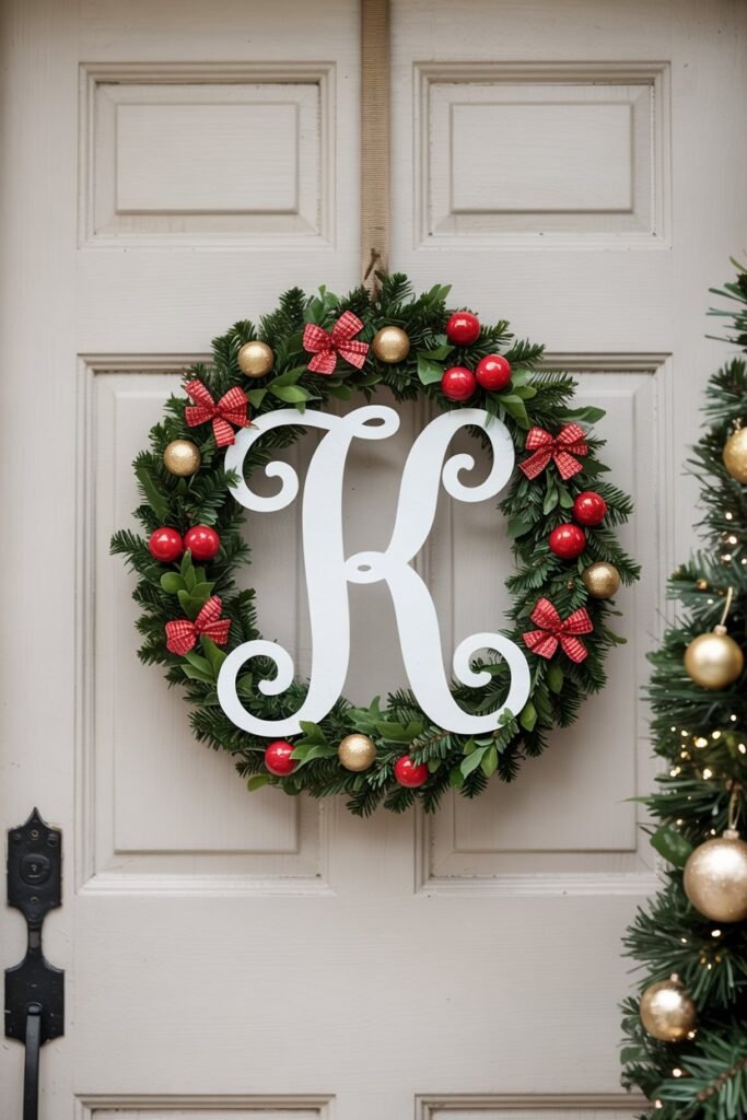 Personalize your front door with a monogrammed wreath. Start with a simple boxwood or evergreen wreath and place a large wooden or metal letter representing your family’s last name in the center.