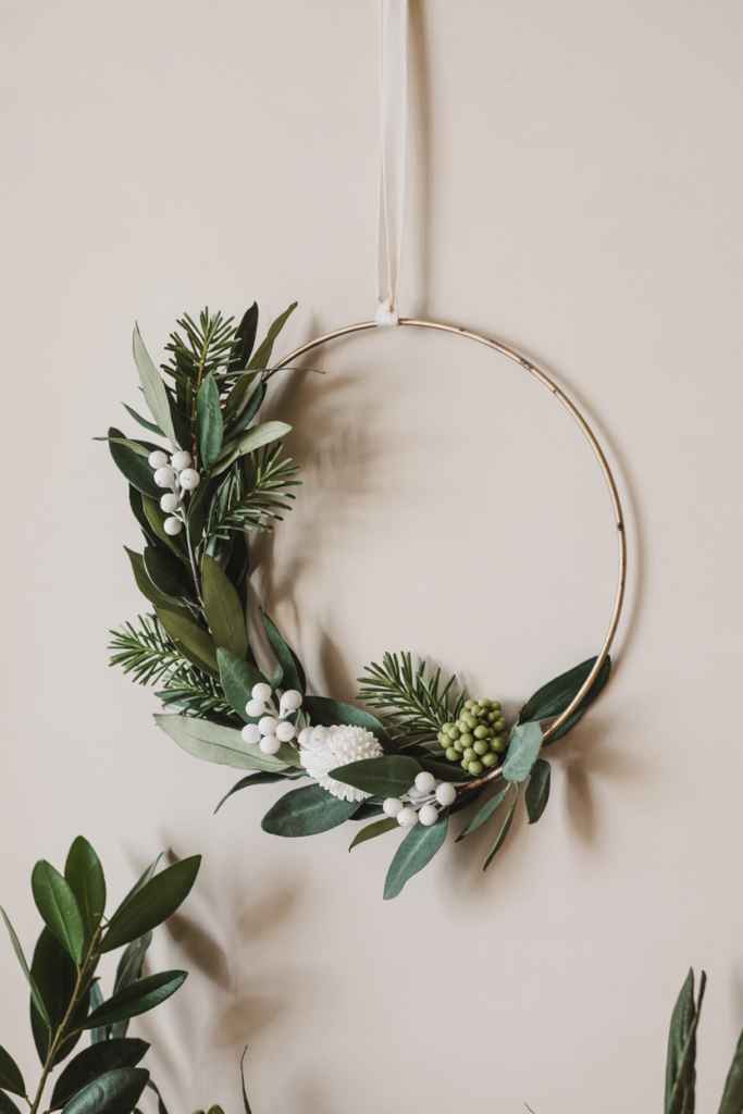 For a contemporary take, try an asymmetrical wreath. Use a simple metal hoop, like brass or gold, and adorn only one side with foliage.