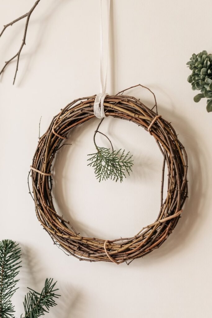 For the ultimate minimalist design, a simple twig wreath is both rustic and chic. Gather thin, flexible branches and bend them into a circular shape, securing them with twine or floral wire.