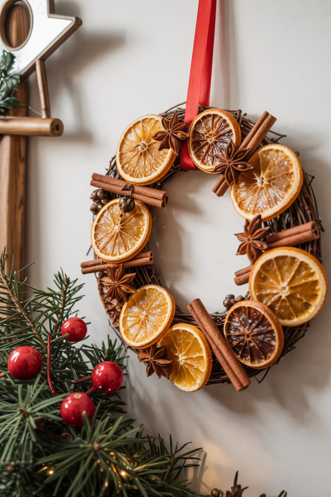 Engage the senses with a wreath made from dried orange slices, cinnamon sticks, and star anise. The warm, spicy aroma is incredibly festive, and the deep orange and brown tones create a cozy, rustic feel, evoking memories of holiday baking.