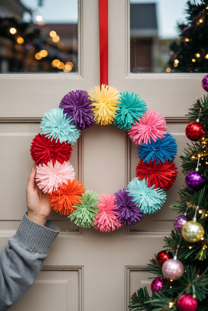 Add a playful and whimsical touch to your decor with a vibrant pom-pom wreath. Use yarn in various holiday colors—or even a rainbow palette—to create fluffy pom-poms of different sizes.