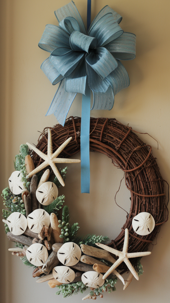 If you live by the sea or just love coastal decor, create a beach-themed Christmas wreath. Use a grapevine base and adorn it with starfish, sand dollars, and small pieces of driftwood, perhaps even some pearlescent shells.