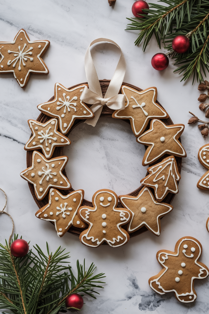 What’s better than a wreath you can admire? One you can eat! Bake gingerbread cookies in various festive shapes—stars, trees, and gingerbread people—and use royal icing to decorate them with intricate details.