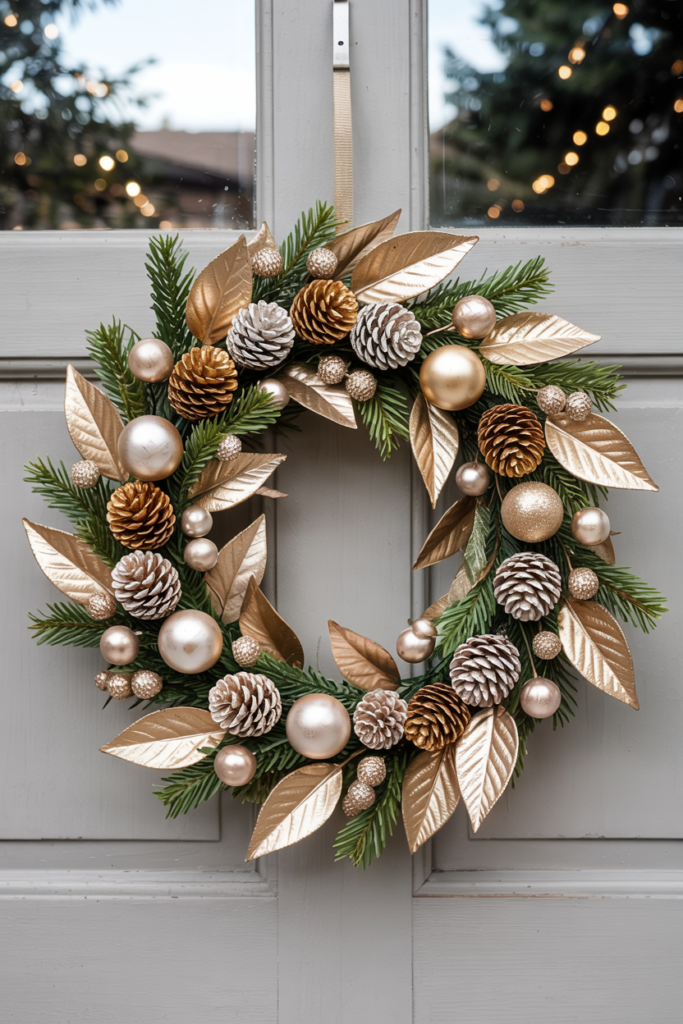 For a touch of sparkle and sophistication, a metallic wreath is a perfect choice. Use spray paint to cover artificial leaves, pinecones, and berries in gold, silver, or rose gold, creating a unified and opulent look.