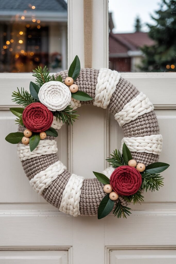 Wrap a foam wreath form in chunky knit yarn for a super cozy and inviting look. Choose a neutral color like cream or grey for a Scandinavian feel, or go for a festive red, deep green, or even a plaid pattern for a more traditional touch.