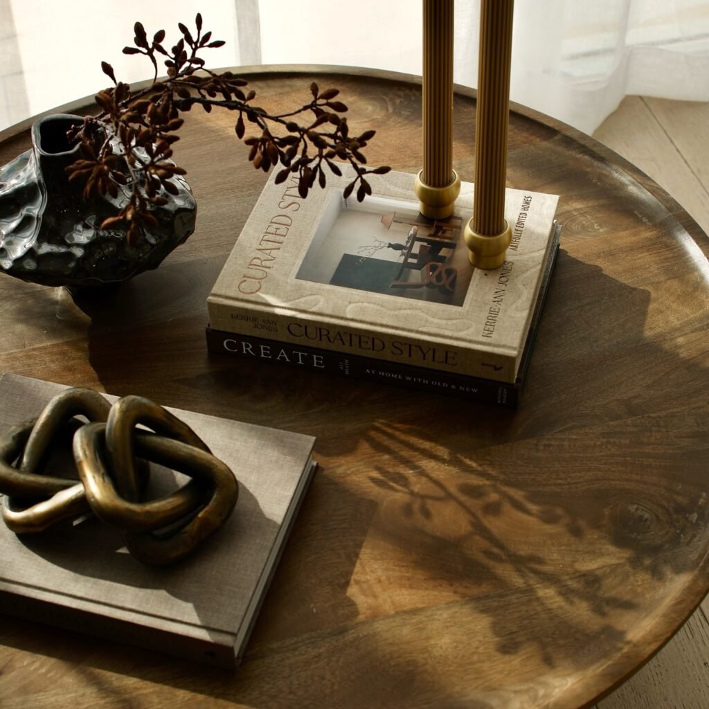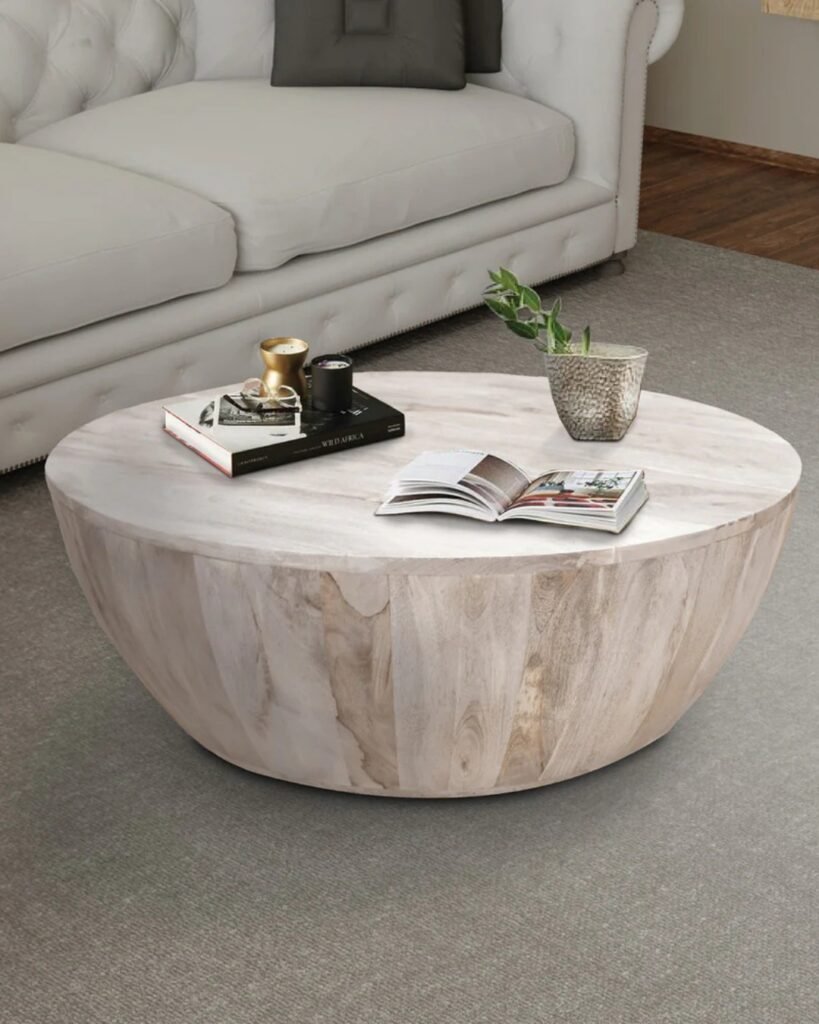 18. Natural Wood Drum Coffee Table with Curated Styling