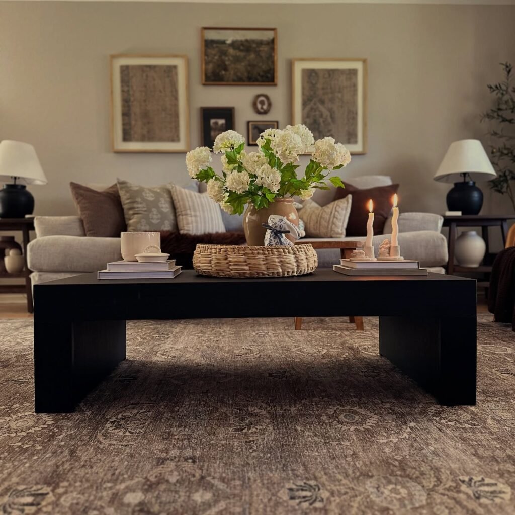 Oh wow, this is what I call sophisticated living room goals! That sleek dark coffee table is the perfect anchor for this beautifully layered space.